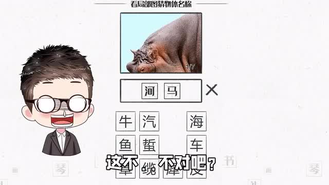 看局部图片,猜物体名称。这还用猜啊,这不是一眼就看出来了吗?河马这游戏完全没难度啊。我去这这不对吧,这个不是河马,还能是啥海马,那也不对呀。啊,不行,我得好好研究一下啊,牛气马海虞哲和车张澜曦皮。