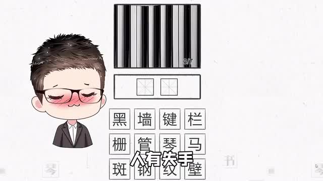 黑白搭配这些字儿能组成钢琴、斑马、钢管,还有墙壁。嗯,我觉得啊最不可能的就这个墙壁。呃,人有尸首,马有尸体啊,哎马斑马啊,不就是刚好是黑白的吗?那是斑马。哎,那这个还不能瞎猜啊,还得讲究点规则的呀。