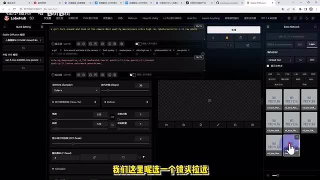 只是这样本身就带有过渡性的这种提示词,质量词呢,我们可以给它加一些。如果我们想让运动动起来,我们就把刚才的loa给它调用出来。镜头运动这里它这里有向左向右向上向下,然后还有镜头拉远和推进。我们这里呢选一个镜头拉远,然后呢在提示词当中也可以写上镜头拉远。这个laura的权重呢代表它镜头的运动幅度,权重越高运动的就越快,运动幅度就越大。大家可以自行去调整接下来这个采样方式跟迭代步数跟我们出图的效果是一样的。