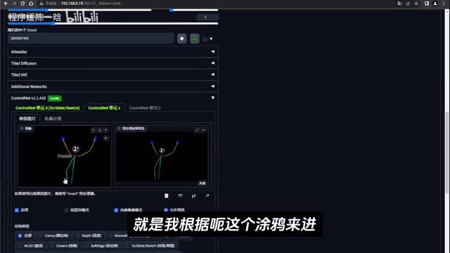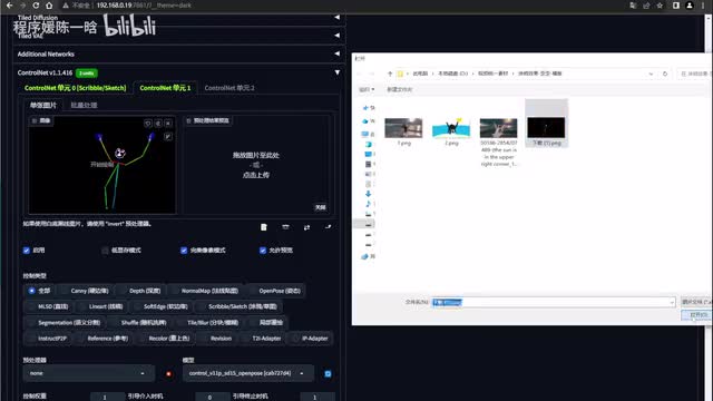 在这里点击启用完美像素,还有允许预览。控制类型和预处理器不用去选择模型,直接选择我们的open pose。在这里上传人物的骨骼图片。在这里呢也要上传一次。为什么要在这里去上传两次呢?因为这种方法可以让s d啊做到去识别出这个人物的骨骼的姿势,让s d来按照这种姿势来进行出图。当然你也可以用open pods当中的d w open pose来实现。