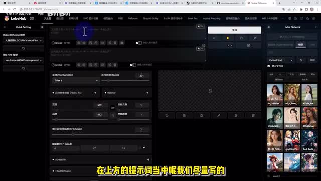 然后现在看到我们提示词这一部分,那么提示词呢我是已经提前准备好了,我将我的提示词呢直接进行放入。那么我现在来简单的讲解一下我所写的提示词。首先来看到我们正向提示词这一块。这些提示词呢就是我根据呃这个涂鸦来进行描述的。那太阳在右上角,一个女孩站在沙滩上那长发黑色头发,左手右手的高举在海边白色连衣裙,我在这里呢都是有进行描述的。那么反向提示词就是对我手部的的畸形残缺的一些描述,还有低质量的图片的产生。