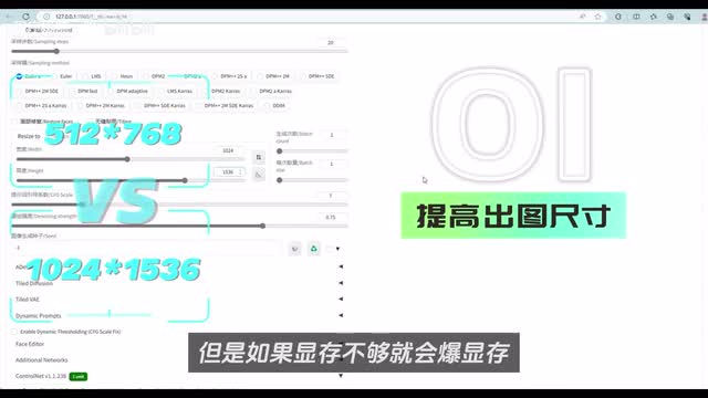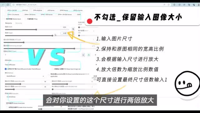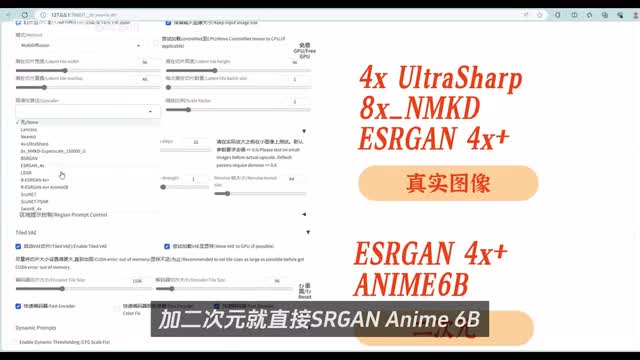 感兴趣的同学可以去看一下daily同学关于这些参数的详细用法。这里我们直接勾选启用,接着来到tile v a e勾选启用。然后高清算法这里真实图像可以选择四x o t十二八x n m k d或者s r g四x加二次元就直接s organ enemy六b我这里选择四x o tra p为例,这里只特殊说明一点,关于这个放大倍数。如果勾选了,保持输入图像大小。这里的宽高尺寸设置不会生效,在出图时会对原始图像的尺寸进行放大,放大倍数就是这里设置的数值。