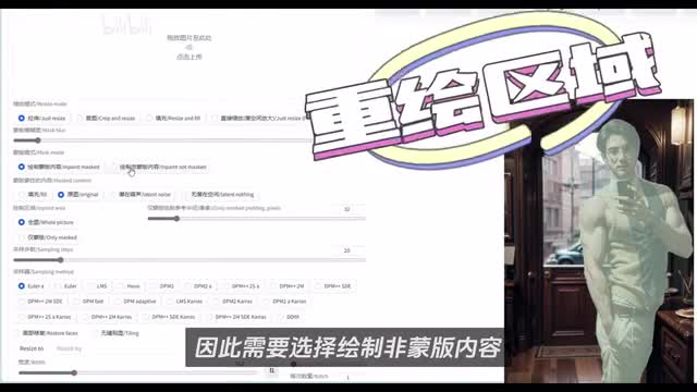 这里。我们要输入的大一些,给a i女友充足的发挥空间。这里我们可以暂时按照默认的零点七五不变之后往上滑动蒙版模式。这里需要注意的是,蒙版是分割出来的人,我们想要重绘的是人物之外的内容,因此需要选择绘制非蒙版内容。另外,绘制区域这里可以选择全图,也可以选择景蒙版,区别在于全图是在我们设置的图片尺寸的基础上绘制蒙版区域,这种方式下内容与原图融合会比较好,但缺点是细节的处理会差一些。