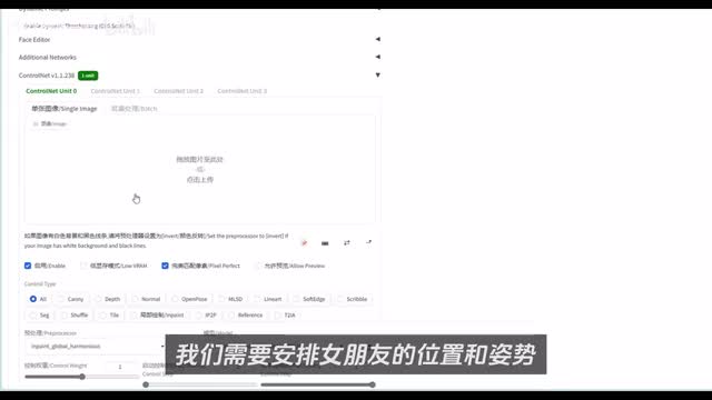 然后预处理器这里我们选择in paint下划线global下划线harmonious可以提高全图的融合效果和一致性。之后模型这里我们选择s d一五in paint,其他的参数如果你不清楚作用,可以暂时不用调整。接下来是比较关键的地方了,我们需要安排女朋友的位置和姿势。这里我们需要启用第二个control net,如果你的界面没有第二个control net,就需要来到设置,将这里的最大模型数量调成二,然后重启就可以看到两个control net了。我这里设置的四,但实际使用过程中几乎没有四个同时开过,每都启用一个control net就会多增加显存的消耗。