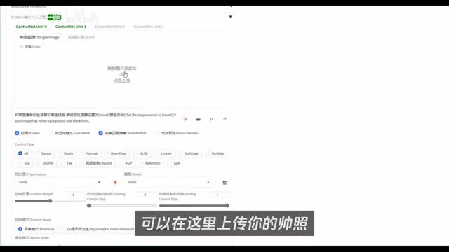 设置好了之后,同样的勾选启用和完美像素匹配。这里可以直接上传你提前做好的位置和姿势图片。如果你不知道怎么制作,可以在这里上传你的帅照。然后控制类型,这里我们选择open pose,点击这个爆炸按钮会自动生成一张预览图,提取你的人物姿势。我们点击编辑会弹出一个open pose的编辑界面。
