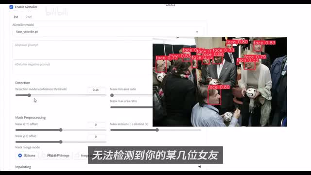 这里我们只修复脸部,就先选择这个非c o o v八n,其他参数可以暂时保持默认即可。当然这里要说明一下,如果你有多个女朋友需要进行脸部修复,可能需要修改这个置信度阈值,这个阈值越高,检测到的脸部就越少。如果默认值无法检测到你的某几位女友,可能就需要下调这个值。另外还有一点需要注意的是因为我们选择重绘的是非模版内容,这里in painting中的in paint only mask需要取消勾选,否则也会出现无法识别脸部的情况。如果你取消了勾选也识别不到,可以选择使用下方的control net模型进行重绘。