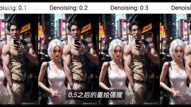 这就是multi fusion的强大之处,它会自动的对画面进行细节的优化,不是和高清化放大一样的声音的放大。而是将放大后图片与原图之间的像素差进行了重绘融合。当然如果你觉得自己的颜值被改变了,可以将重绘强度调低或者直接设置为零。这里我们在其他参数都不变的情况下,在脚本这里选择x y z图表类型,选择重绘强度,输入生成零到零点四的不同重绘强度的对比图片。可以看到同样的放大倍数下,画面的细节逐渐发生改变,悄悄的就将男主替换了。