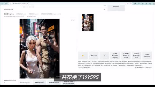 我们暂时先设置零点三,后面我会为大家对比同样的放大倍数下零点一到零点四的重绘强度,然后我们点击生成。这个过程会比较长,需要耐心等待。我直接快进了。等待生成完毕,可以看到一共花费了一分五九s生成了一张接近四k分辨率的图片和原图进行对比。除了尺寸有所放大之外,可以看出整个画面的部分细节也发生了变化,我的胡子也被优化掉了不少,从中年大叔变成了青年俊杰。