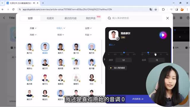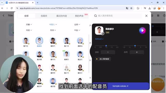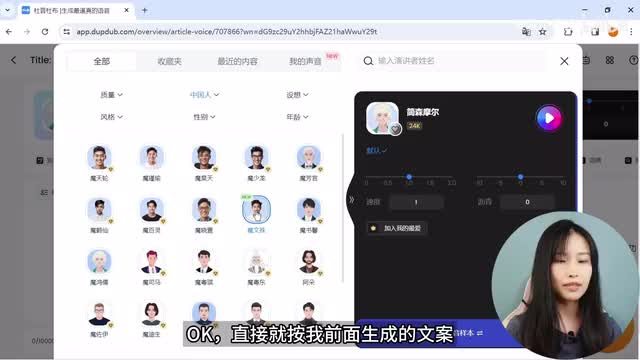 嗯,你们觉得像我的声音吗?如果让我打分的话,给七十分吧。如果想获得理想中的声音,大家可以尝试在上传音频的时候选择更长的时间,方便a i分析获取。ok回到全部声音,找到前面选中的配音员,调整好语速,右下角点击确认,回到文案面板,在这里也可以随时调整语速和音调。好了,下面是非常实用的功能。单画外音就是我们现在一个文案配一个配音员,而多个配音功能就是可以添加不同配音员。