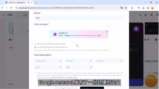 选择一个大约十m b的音频文件。这是我之前影片里的一段音频,上传成功可以试听。网友们又出大事了。最近google research发布了一份劲爆的论文,展示了最新一代的文本转视频生成器路面,这可能是你见过最顶尖的ai视频生成工具。好,ok, 下面完善一下声音描述。