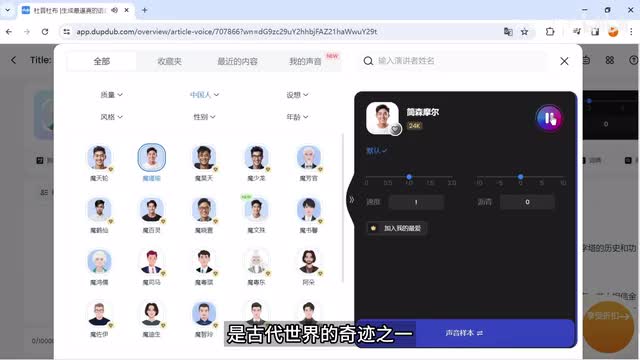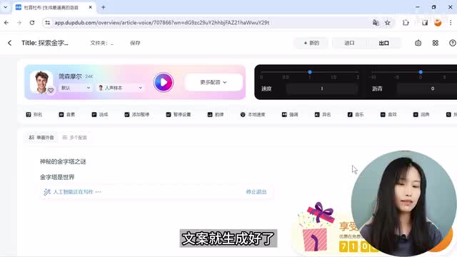 大家好。今天,我们将带您来探索古埃及金字塔。这些令人惊叹的建筑是古代世界的奇迹之一。首先我们来介绍最著名的金字塔,胡夫金字塔。ok, 直接就按我前面生成的文案来进行配音了,可以更换在试听,直到选中你想要的配音员。