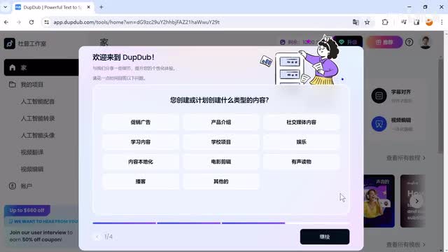 电影制作、编导、电话销售等等。不管你从事哪个行业,都不要错过这个宝藏应用。点击右上角注册按钮,可以通过电子邮箱和密码登录,也可以使用社交媒体账号登录,回答几个新用户问题,获得三天免费试用期。在ddb我们的创作流程是a i内容写作、编辑语言、生成音频、导入素材、制作视频主页能看到平台支持的几大功能模块。下面我会从零开始创建一个揭秘探索类的视频,让大家去了解这些功能。
