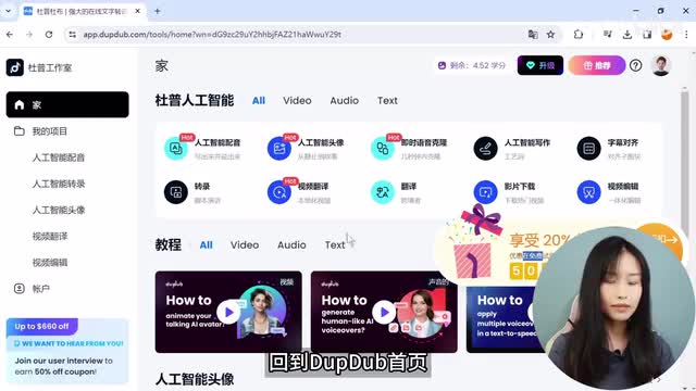 hello, 如果你是一位内容创作者,千万不要错过本期影片。今天分享一个真正能简化工作流程的一体化创作平台。先说说它的基础特点,多达一万字符的a i文案,五百多种超真实配音,人工智能头像以及智能视频编辑。再来说说它最出色的功能,支持文案语言翻译协助,支持逐字发音、声调编辑,支持段落词句的韵律节奏调整,支持一篇文章里有多个配音员。所以它的用户群体特别广,市场经理、广告设计师、教育培训师、各媒体平台博主、有声读物创作者。