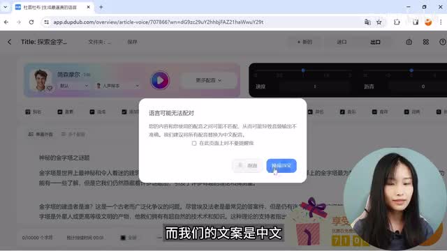接着我们开始编辑配音,页面的左上角显示了当前的配音员默认按钮,下面是配音员的不同语气,人声样本是这个配音员的声音特点,可以点击播放按钮进行试听。如果弹出对话框提示语言无法配对的情况,一般就是配音员的语言和我们的文案语言不同。比如配音员是美国人,而我们的文案是中文。点击换成中文系统,就自动帮我们换了一位中文配音员,点击配音员的头像或者点击后面的更多配音,都可以来到配音员界面,有五百多种超真实配音可以选择设置筛选条件有广东话、普通话、台湾,还可以筛选类型、风格、性别、年龄。点击头像右侧播放按钮可以试听。