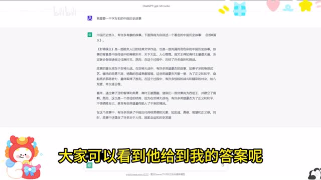 比如说我们现在以故事为例,我在这个chat g p t提问,我需要一份一千字左右的中国历史故事,帮我写一下。大家可以看到他给到我的答案呢是一个一千字左右的文案就生成了。当然了我也只是给大家演示一下,大家可以自由发挥脑洞。