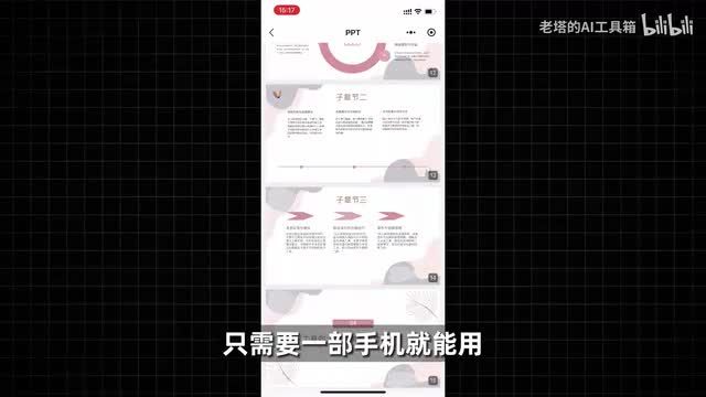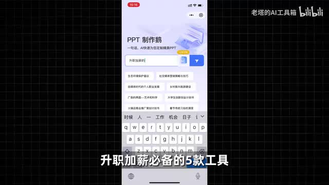 打开小程序搜索p p t制作,额,输入你的主题,比如帮我生成升职加薪必备的五款工具,再选择一个模板。