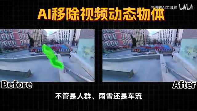 第一个super pose,这个a i能瞬间移除视频里的移动物体,不管是人群、雨雪还是车流,一键这个去除效果非常强大,而且丝毫看不出任何痕迹,任何动态场景都可以实现。