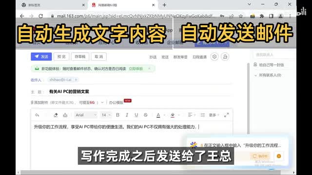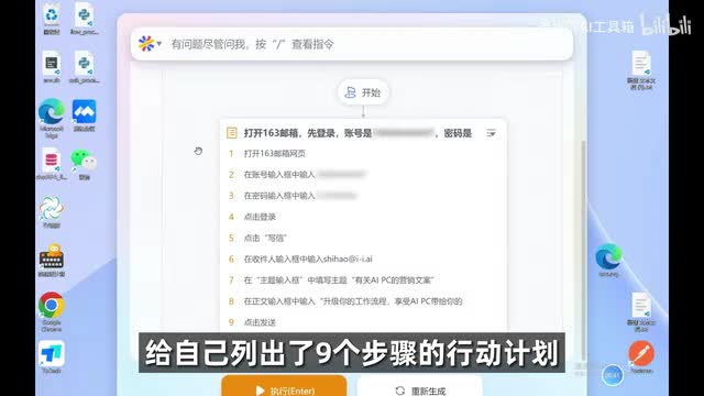 比如我让他给王总发送一篇关于a i p c的移交文案,小助手给自己列出了九个步骤的行动计划,点击确认执行不到一分钟,小助手就自动登录了我的邮箱,接着小助手自动写了一篇营销文案。