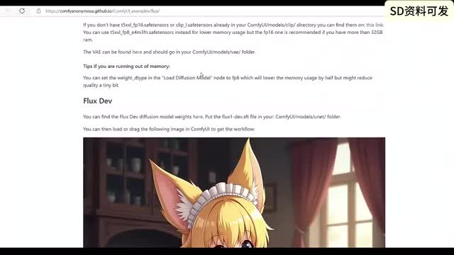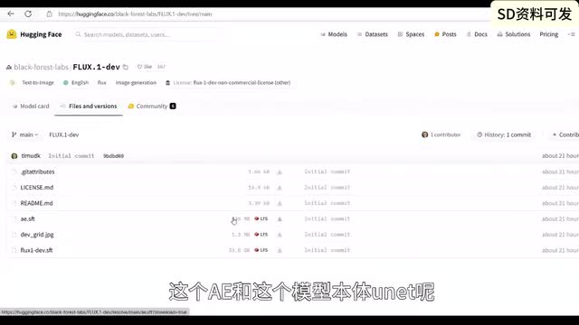 这边呢我们点到文件里面可以看到呢,这个文件这边它的格式呢是s f t,这个格式呢可能是一个新的格式啊,这边呢是unit部分,一部分呢就有二十三点八g s的,现在是二十二g好,这个a e呢其实就是我们常用的v e,这个a e和这个模型本体u net的这两部分都要下载下来。啊,然后我们发现少了一个什么东西呢?对,少了可以。我们现在来到的是康复u i提供的一个啊例子里,这个td flex提供的一个例子。这边提到呢我们的clip呢可以从他这边下载。