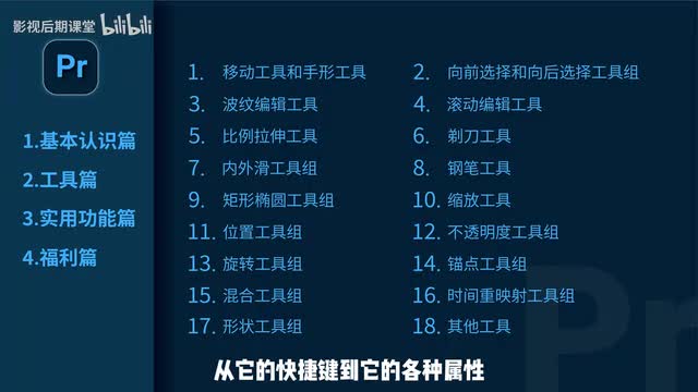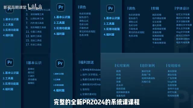 让你真正的感受到什么是每秒都在疯狂的输出知识点,更能够让你知道什么叫做资深撒哈拉。那我们这一套课程呢会从一个基础认识篇、工具篇、实用篇等三大。方面来讲解基本的认识里面包含了基本菜单、基本操作以及视频这三方面。让你最基本的去认识我们学的这个工具它是由什么组成的,让你快速并了解掌握整一个p r的工作流程。