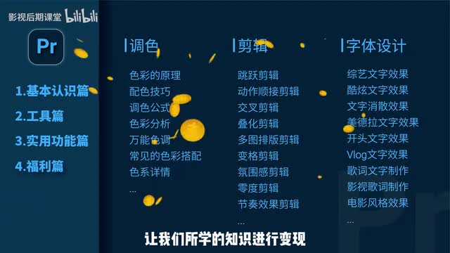 实用工具里面呢我会带大家认识调色、滤镜、氛围剪辑以及与字体设计交朋友。用最历史沉淀的剪辑理论思维,最后与实践操作交战,让我们所学的知识进行变现,流进我们的口袋。最后呢还会给大家一个小福利,视频里面所有的课程素材呢都可以添加评论区联系方式咨询领取。不仅有课程里面用到的素材,还有p r从零到一的学习计划。