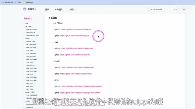 另外他还开放了a p i调用。也就是你可以在其他软件中使用它的a i p p t功能,或者你自己做个a i p p t软件,直接接入它的a p i就可以去推广赚钱了。