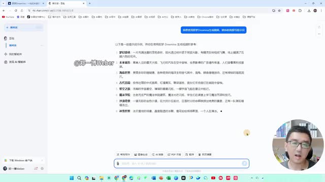 那我们先试一下文字生成视频,在这个输入框里面就可以输入我们的提示词了也就是你希望它生成的画面内容。那如果大家是一个初学者,第一次使用这样的功能的话,建议大家不要自己去写提示词,因为生成的效果可能并不好。那我们可以使用a i工具来帮我们创作提示词。在这儿呢我就选择了豆包这款,同样也是字节跳动的一款产品,然后在输入框里面可以输入我们的需求。
