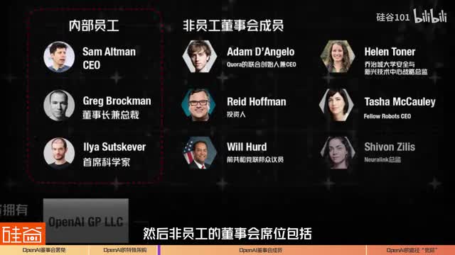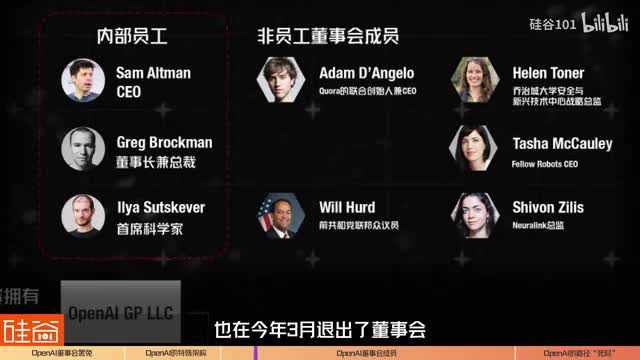以及呢脑机接口公司n e r l i n k的总监史bond。the list本来呢是有九个人,但是呢啊ray hoffman因为要投资另外一家a i公司,更新利益冲突呢,在今年三月份是退出董事会。翅膀the list呢因为是马斯克双胞胎娃的妈,因为马斯克和open a i撕破脸的关系呢,也是在今年三月份退出了董事会。bel herd呢因为宣布参加二零二四年总统竞选,在今年七月份呢是退出了董事会。所以呢我们看到董事会呢是成了sam、greg还有伊利亚三名员工,再加上三名非员工的独立董事,一共六个人。