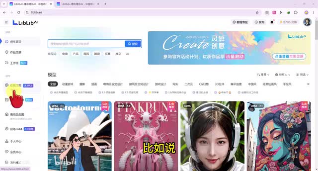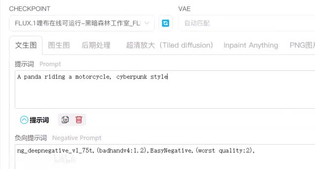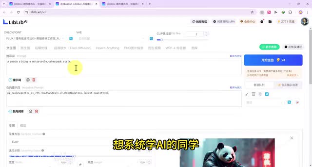 如果你要让它翻译成中文,那么你直接把它的目标语言做一下切换就可以。另外在国内很多在线作图的平台上,我们也可以使用这个方法,因为这些平台都是基于网页浏览器的。比如说我在lip lip ai里面选择在线工作流,在这个工作流页面上正向提示词里面,我输入一只熊猫骑在摩托车上,然后赛博朋克风格,连按三次空格,它就直接被转换成了英文。