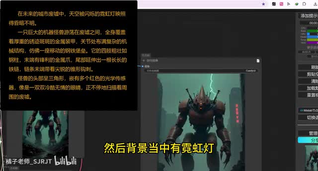 使用conf y u i的时候,你还在用这样古老的方式获取它的英文提示词吗?今天给你揭秘一个极其好用的小技巧,英文不好的同学一定要看到最后打开conf u i,我只需要在这里输入中文,快速按三下空格,它就会直接转换为英文提示了。画面主要体现了一个未来城市的废墟,然后背景当中有霓虹灯比较灰暗,一个大的机器怪兽在行走,它的全身都是金属的装甲,有粗壮的四肢和金属爪,尾部还有一根长长的铁链,头部呈三角形,然后欠有红色的光学传感器。画面和我们的提示词是非常吻合的,我们可以再换一段提示测试一下。