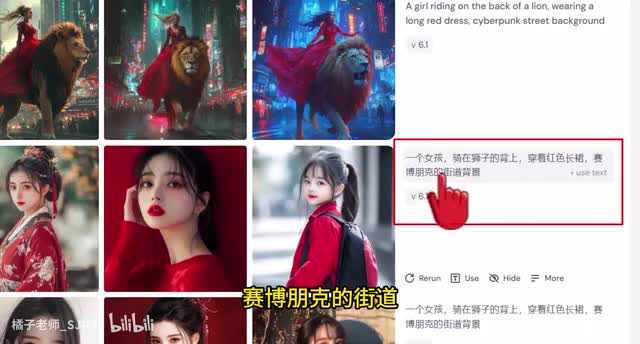 它是无法识别中文的。比如说我在这里输入了一个女孩骑在狮子的背上,穿着红色长裙,赛博朋克的街道出现的内容并不正确。如果我将它翻译成英文,再给到没journey,它的这个图像生成就是正确的内容了。