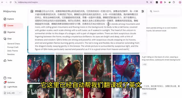 现在我们可以来测试一下,我把描述麒麟的中文直接复制粘贴到这里,连按三次空格,他这里已经自动帮我们翻译成了英文。中文内容删除掉就可以,按回车键,major i就可以在这里直接帮我们做出图像。大家可以看一下它的效果,它更有中国画的感觉。