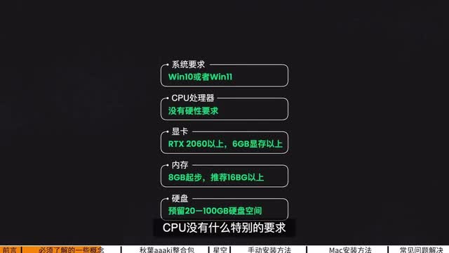 但是max电脑和a n d显卡的电脑啊是通过c p u来渲染的,生成的图片速度会比较的慢。所以推荐大家搭配m一点显卡的windows电脑来使用。首先系统要求是win十或者是win十以上的系统,c p u没有什么特别的要求,只要不要太老旧就行了。显卡推荐r t x二零六零以上级别的显卡,六g b显存是标配,最好是八g b及以上的显存。内存至少是八g b,而配备十六g b或者是以上的内存,你会有更好的使用体验。