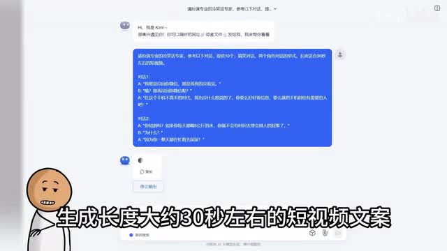 好,现在我们来使用ai对话工具来生产文案,我们打开kimi,输入以下内容,让kimi生成十个个搞笑故事,以第一人称或者对话的形式生成长度大约三十秒左右的短视频文案。可以看到a i很快就给我们输出的文案内容。第二步,生成音频。我们打开非洲交流这款工具,不仅是免费的这里面有上千款克隆好的声音模型。