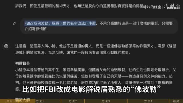 二、从粉丝角度出发,做粉丝爱看的电影类型。比如男性偏爱动作片或者科幻片等类型,大部分人还是会被悬疑科幻。或者喜剧片吸引曲折反转多爽点足,爆炸追逐场面都非常吸睛。三、选择一些有趣小众的电影,比如这个账号就以解说印度战神电影出名,完全颠覆你的认知。好的,我们这一次解说基础版就来讲解一下豆瓣top四十二电影猫鼠游戏。首先我们当然是打开我们的老朋友chat g p t,让他帮我们写一篇电影猫鼠游戏的电影情节剧情解说。