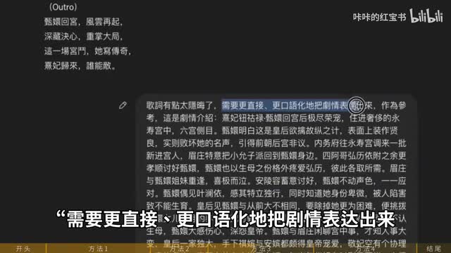 现在我要制作一个影视解说的短视频脚本,请你写一篇歌词,歌词要反映甄嬛传五十六集熹妃回宫这一集的主要情节和场景,要通过故事把这一部电影的脉络解说清楚,让人听完这首歌就像看完了这部电影。很快在g p t就给出了歌词,但我还是嫌他写的太文绉绉了,所以我继续提出润色要求,需要更直接更口语化的把剧情表达出来作为参考。这是剧情介绍。根据润色,chat g p t给出的歌词就还顺眼多了。接着我们直接打开solo点击自定义模式,并把chat g p t帮我们生成的歌词直接复制粘贴到所有的歌词文本框,并把音乐类型规定好为嘻哈点击create。这个时候我们就等待苏诺帮我们妙笔生花了。