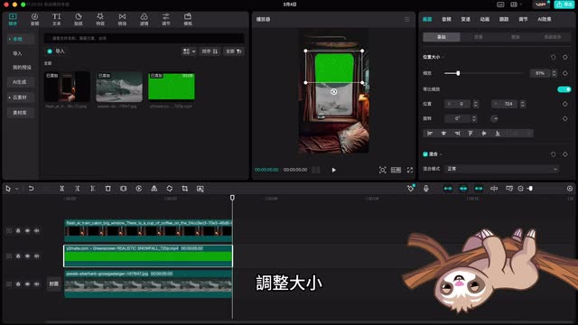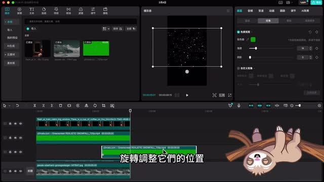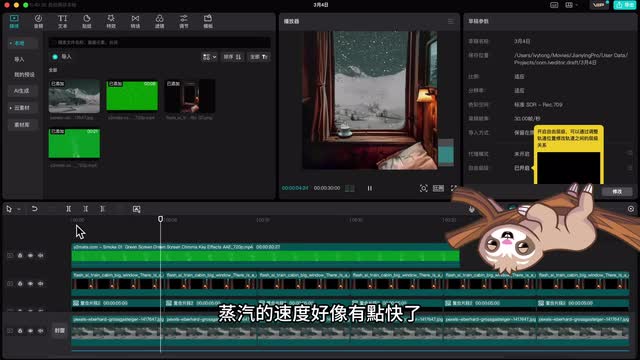 列车是不是跑起来了?接着我们来做下雪的效果。导入绿幕素材。插入到车厢与雪景的中间涂层。调整大小,使雪铺满整个车窗。在参数区找到画面抠像、色度抠像。用取色器拾取绿色。调整强度的滚动,调至合适的位置。