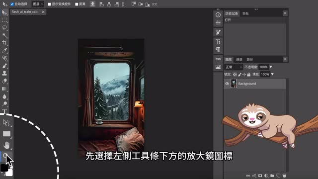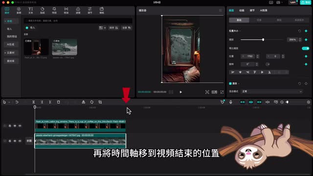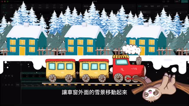 让雪景出现在车窗外面。且需铺满整个车窗。那怎么让列车看上去是在行驶呢?答案是。让车窗外面的雪景移动起来。这里要使用到一个非常实用的功能,叫做关键帧。将时间轴移动到视频开始的位置。选中雪景图。