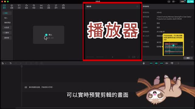 第四步,剪映加工剪辑。打开剪映,先简单介绍下操作界面上半部分左边是素材库,提供各类音频特效、转场、滤镜等素材。中间是播放器,可以实时预览剪辑的画面。右边是参数区,可以调整素材的大小、位置、播放速度等,提供更多样的编辑功能。下半部分则是剪辑的时间轴啦。我们把列车车厢与雪景图片都导入进来。调整雪景图片的大小以及两张图片的位置。