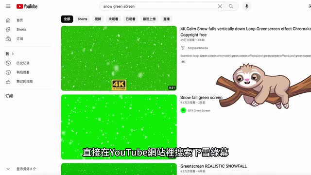 我想让窗外看起来是一片雪景,并且正在下着雪。我们需要寻找一张雪景的照片或者视频。这里推荐两个优质的无版权的图片及视频素材网站。我觉得这张雪景图不错,下载下来。接着是下雪的绿幕素材,直接在youtube网站里搜索下雪绿幕,在搜索结果中进行过滤,选择知识共享出来的结果就都能使用了。我觉得第一个就不错,复制链接,打开视频下载的网页,贴入链接,把它下载下来。素材都准备好了,我们开始加工吧。
