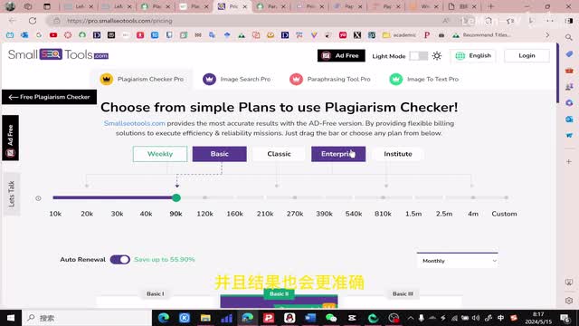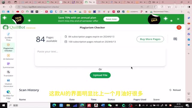 我会在下一期介绍它的查重功能是需要付费的。三种付费套餐分别是单月十美元包季度二十五美元和包年六十美金。这个价格听起来挺贵,但是如果你频繁使用特点进行查重的话,其实还是蛮实惠的这款a i的界面明显比上一个友好很多,每个月有一百页的页数限制,超出部分每月大约收取零点一美金左右。创业找到了前两篇文章,并且也没有标注我自己的文章。但是他同样没有找到最后一篇文章。