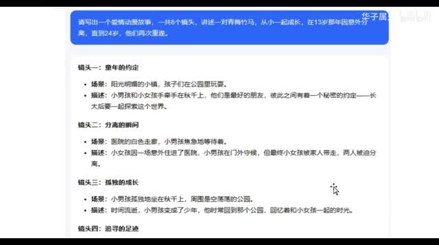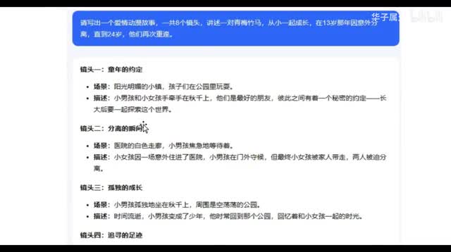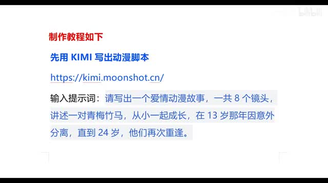 时间的沙漏静静流淌,当重逢的钟声敲。这瓶看完了,那接下来讲讲制作教程的这样的一个流程啊。那首先我们先用提米写出动漫的脚本啊,那这个提米的网址啊也输注入在这上面,大家直接来用就可以啊。那我们输入这个提示时,是啊按照爱情动漫故事啊,一共八个镜头啊,讲述一对青梅竹马从小一起成长,在十三岁那年因意外分离直到二十四岁。