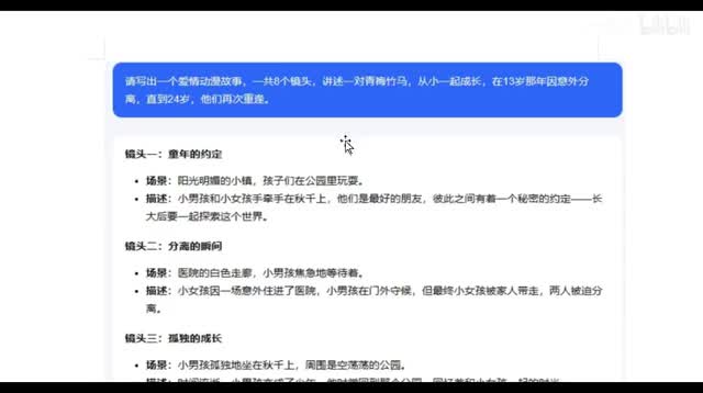 他们重逢。按这个指提示时要替你写出。我们的稿子。好吧,那你一输入完之后啊,天你就开始工作啊,然后立马就能生出啊镜头一、镜头二是吧?总共八个镜头,按照我们这个指示啊去生成。
