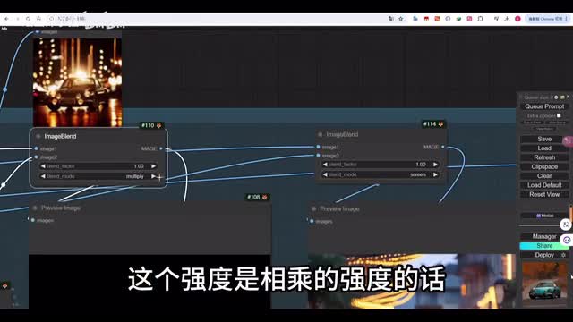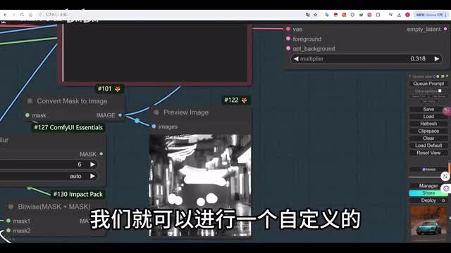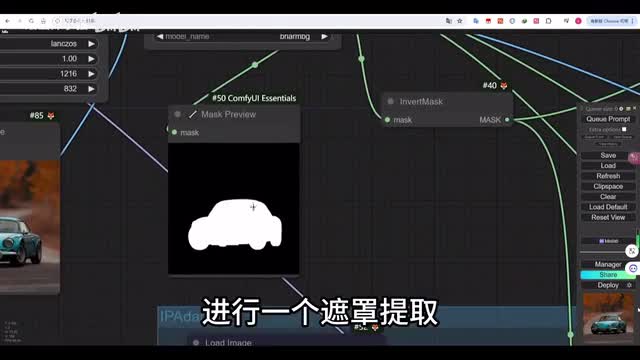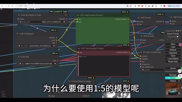 我们这里写的提示词呢是城市的灯光散光,它是提取的这个提示词来生成灯光的。那么上面这一个提示词的话,我们输入汽车的单词啊,那么它可以就是按照这个提示词呢,就像我们素材图片的汽车进行一个遮罩提取来生成遮罩。那么在这个提示词节点组里呢,这个提示词替换也是相当的重要。我们再回到i c light这个节点组里面,那么在这里呢我们还有一个v a e的编码器没有使用。