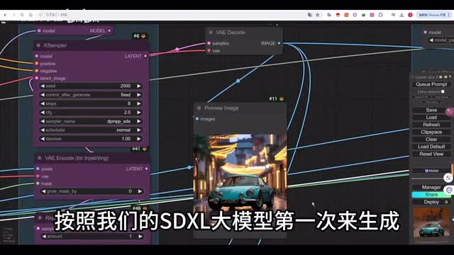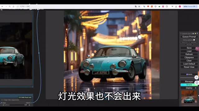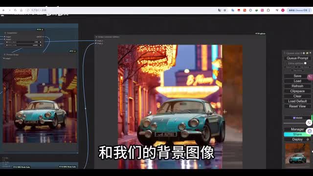 如果我们想换一种新的风格,我们就直接在i p u dep呢这里去换一个新的参考图像来更改风格就可以了。然后我们点击新的风格生成,这样的话我们就会可以改变这个汽车的背景。那么我们这个i c lit节点组为什么要使用一点五的模型呢?因为它不能够跟s d x l模型进行一个配合,它只能跟s d一点五的模型进行一个配合。那么同时呢我们打灯光使用i c light,它所使用的这个提示词呢,是使用我们前面的这个background,这个背景的提示词来进行一个生成灯光的。