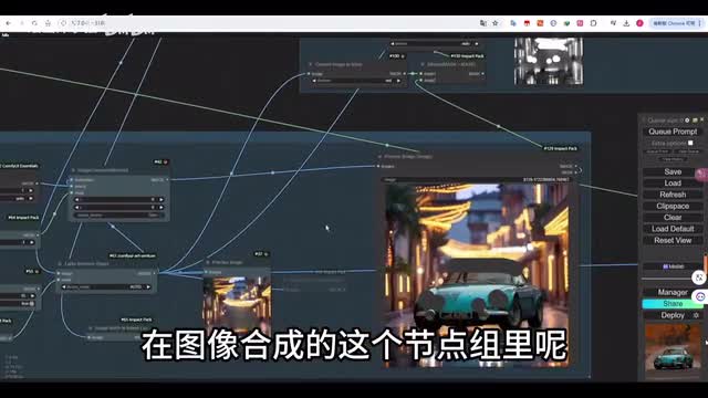 可以用来生成打过灯光的通道图,来生成一张产品的光效图。最后我们将图像的图像呢进行一个混合,来混合出最终我们想要的法国灯光的一个效果图。我们可以将图像合成的这个节点组里面,我们将第一步我们生成好的这个随机抽取的结果图像,我们可以点击右键对它进行一个遮罩的一个编辑。比如说我们将车顶和车的前面的灯光部分。
