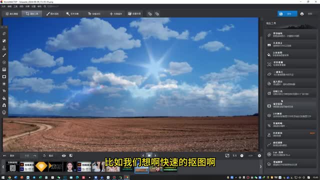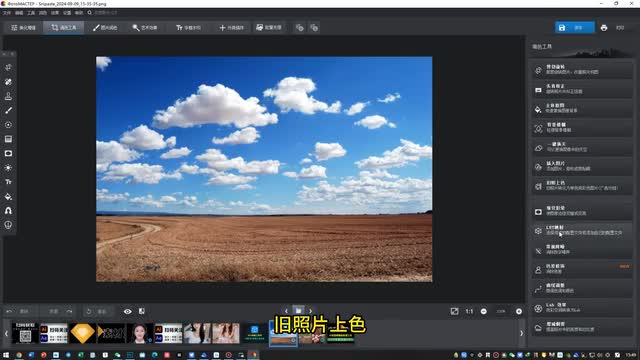 然后我们打开这个图片以后,在这个软件的上方的状态栏可以看到它包含了非常的多的功能。比如主体抠图、背景模糊、一键换天,旧照片上色,或者是net映射,或者是调色等等。我们在这里面因为这是一张天空的照片,我们选择一键换天,它就会自动识别我们的一个天空效果,然后我们等待它识别完成。