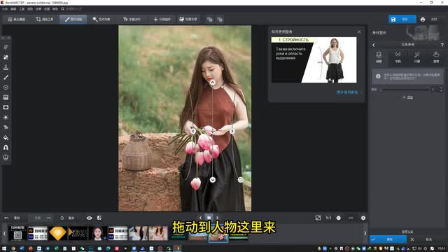 然后同时也是可以对这个身材进行塑形的。我们可以看到这里面出来了一个工具,然后我们把这个工具拖动到人物这里来。我们现在点击这里有个封腰,然后我们点击可以看到人物的腰部就逐渐变小了。