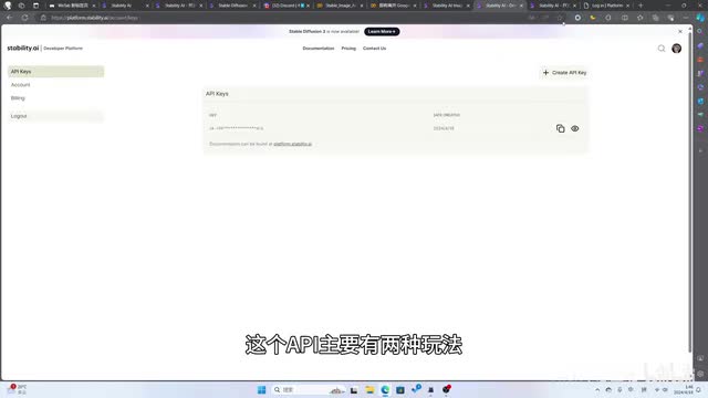 如果你需要使用stability fusion三版本的绘画接口,我们首先要来到它的开发者平台,然后在这个页面当中前往k的一个注册页面,注册一个官方授权的talking。这个过程呢咱们需要学术加速,懂的都懂啊。兄弟们。目前这个a p i的消耗talking的一个费率计算是生成一张图片需要六点五个点,注册之后总共有二十五个免费的点可以供我们使用。