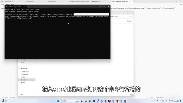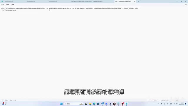 那首先我们在官网的开发者平台主页去找到stability fusion三的接口。然后我们去点击到它这边的一个c u r请求方式的脚本命令,这边我们直接把c u r命令复制下来,然后粘贴到记事本里面,把它所有的换行给它去掉。那这个命令当中呢,首先你要把自己的talking给它粘贴进去,这里我为了方便展示就给大家打码了。然后有一个杠f print的参数,就是你需要去请求的提示词内容,这里你可以自由的修改。